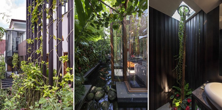 另外,業主對住宅的花園和綠化一直很重視。前兩所住宅中種的樹已經超過木陽臺了,這次在垂直的木棚架上種上了很多攀援植物,可以一直長到屋頂的游泳池。連住宅的浴室也都面向花園,能看到蔥郁的花和蝴蝶飛舞,這是一個真正的垂直花園別墅。