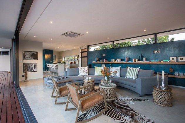 藍(lán)色主題別墅的設(shè)計(jì)裝修,運(yùn)用方正幾何體外形組合,內(nèi)部融合海洋元素,呈現(xiàn)藍(lán)色視覺(jué),居住其間得到無(wú)比的平靜與心靈的安適。棕櫚色的外立面,搭配標(biāo)準(zhǔn)的幾何線條,合理的采光與大面積玻璃的靈活運(yùn)用,內(nèi)外通透又兼私密實(shí)用,混合晴藍(lán)天空,使內(nèi)外藍(lán)色構(gòu)成一體,圍院清澈休閑泳池,將奢華又崇尚高質(zhì)量的生活理念一一詮釋。